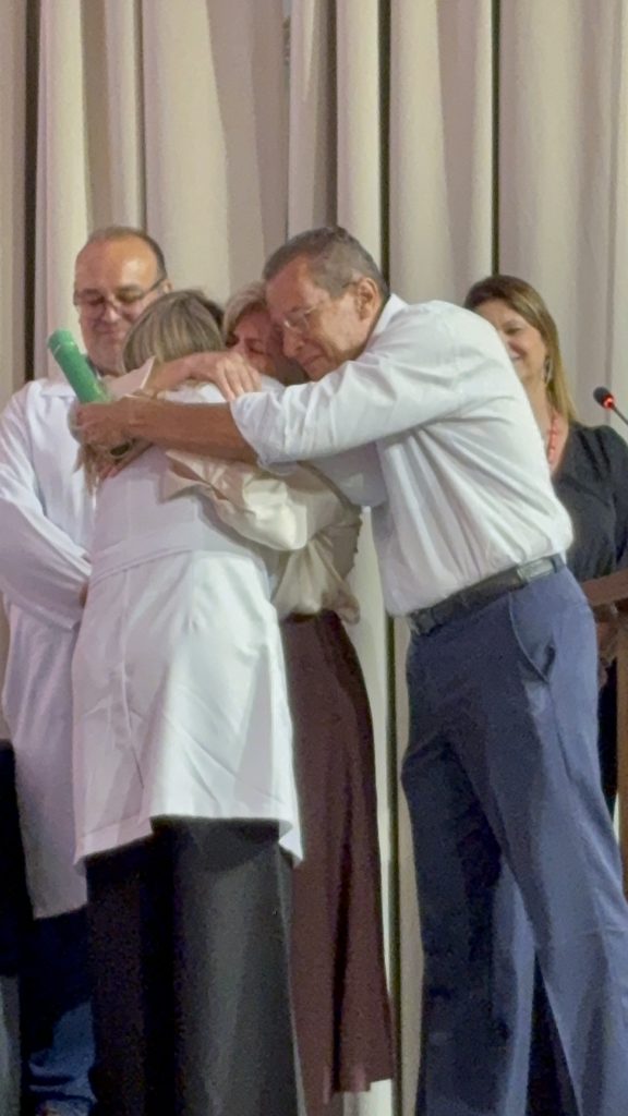 Um dos momentos mais tocantes foi a homenagem à professora Emirene Maria Trevisan Navarro da Cruz, médica de São José do Rio Preto e avó de uma das formandas, reconhecida por sua contribuição ao ensino e pela formação de inúmeros médicos que hoje atuam na cidade.